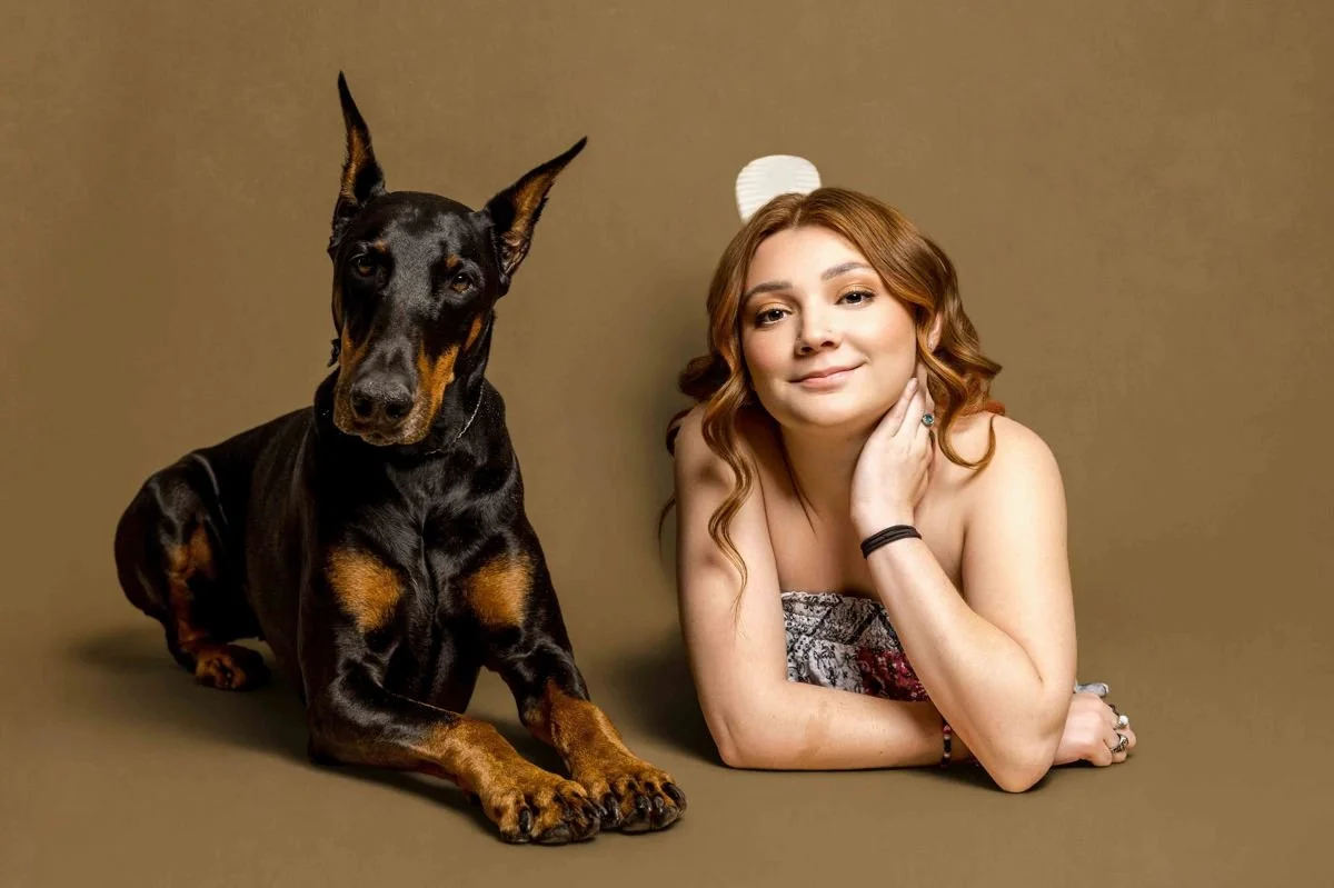 One recent session that captured all the spirit of this personalized experience was with McKenzie and her Doberman, Ryder. We started off with playful images of the two of them together—there’s something so sweet and special about the bond between a senior and their pet.